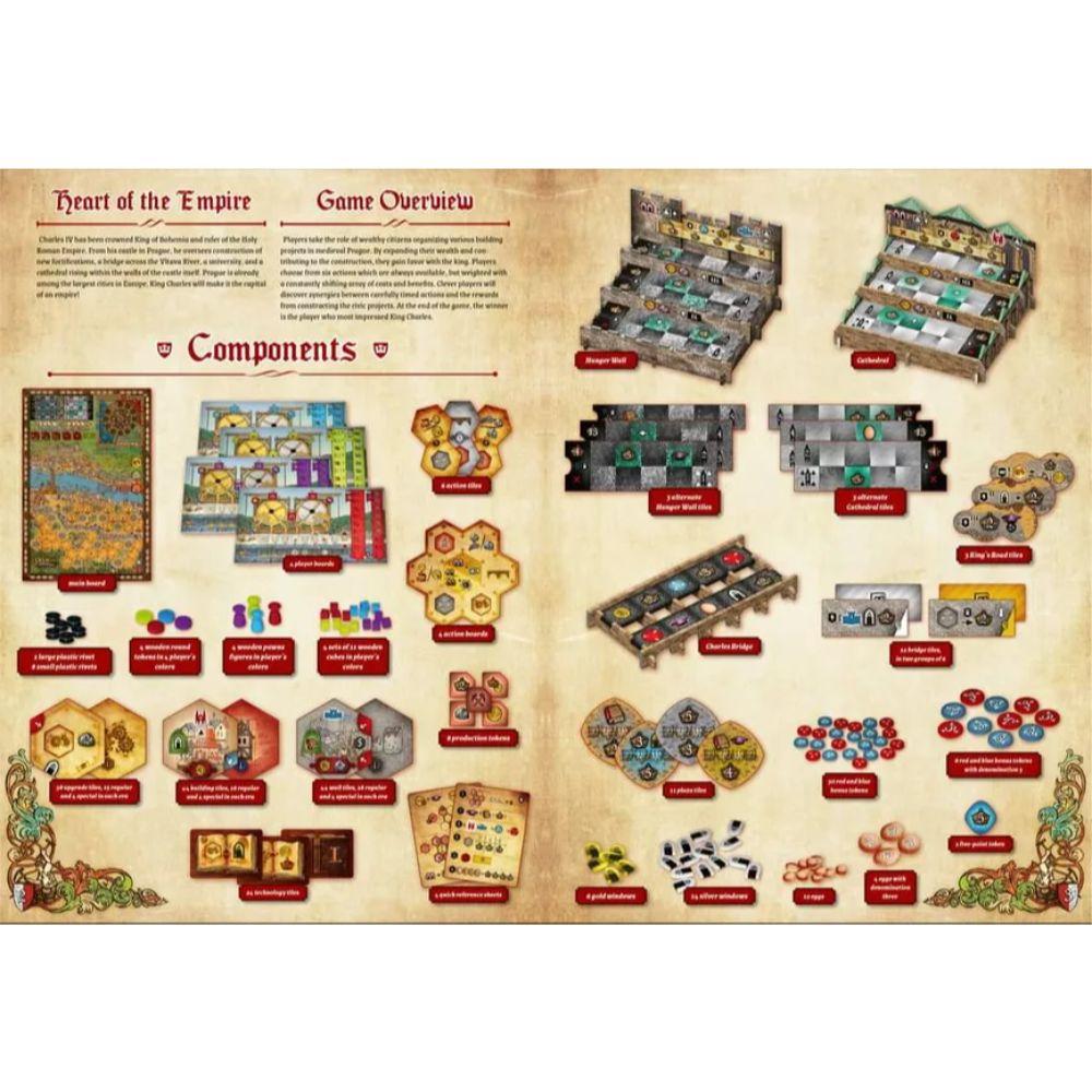 Charles IV has been crowned King of Bohemia and ruler of the Holy Roman Empire. From his castle in Prague, he oversees construction of new fortifications: a bridge across the Vltava River, a university, and a cathedral rising within the walls of the castle itself. Prague is already among the largest cities in Europe. King Charles will make it the capital of an empire! In Praga Caput Regni, players take the role of wealthy citizens who are organizing various building projects in medieval Prague. By expanding their wealth and joining in the construction, they gain favor with the king. Players choose from six actions on the game board — the "action crane" — that are always available, but which are weighted with a constantly shifting array of costs and benefits. By using these actions, you can increase your resources, improve the strength of your chosen actions, and build "New Prague City", the Charles Bridge, or city walls. You can possibly gain additional actions or even participate in the construction of St. Vitus Cathedral. Clever players will discover synergies between carefully timed actions and the rewards from constructing civic projects as all of the mechanisms mesh together. At the end of the game, the player who most impressed King Charles wins.